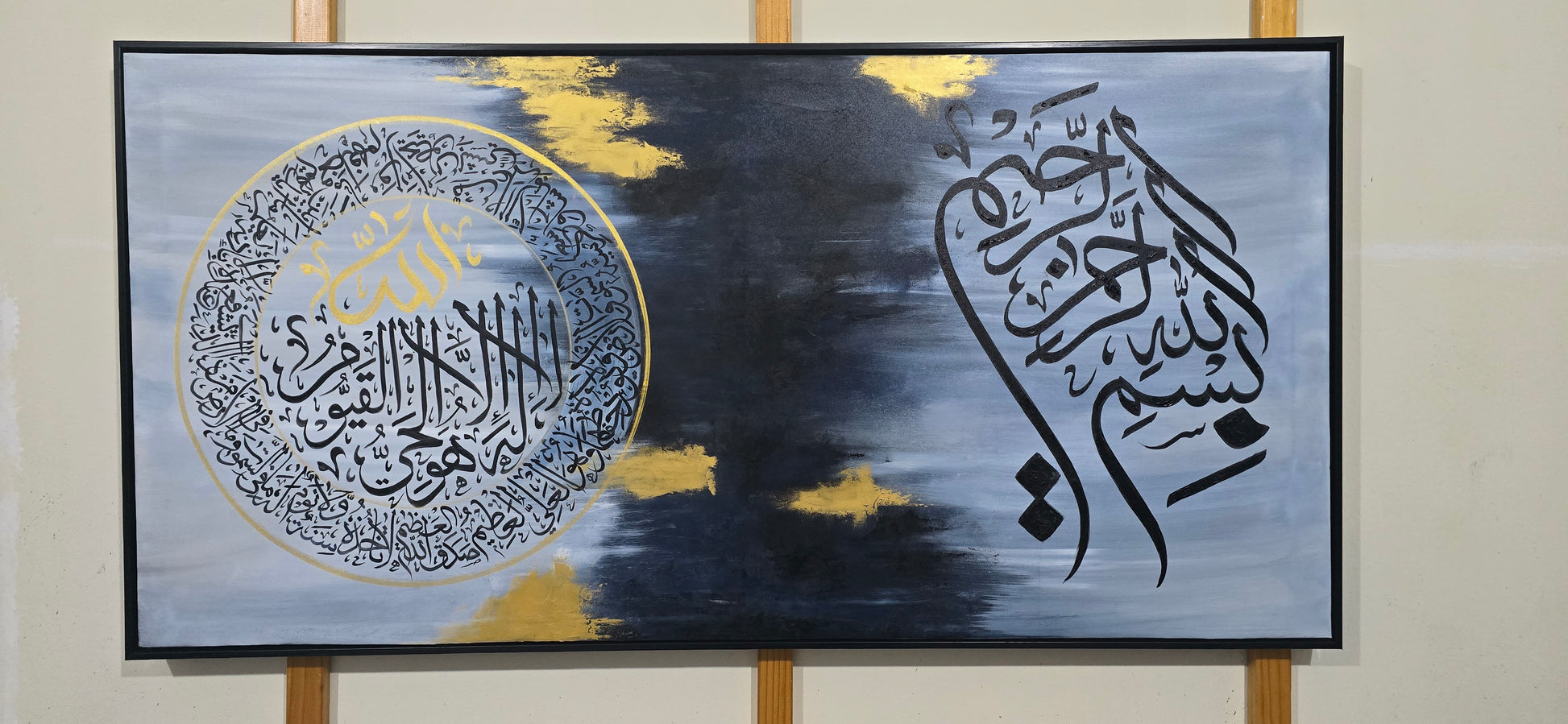Elevate your interior with this luxury Islamic calligraphy wall art, featuring elegant Arabic script blended with contemporary abstract textures. Designed in calming grey tones with striking black calligraphy and gold highlights, this modern canvas artwork adds spiritual beauty and sophistication to any living room, office, or prayer space.
