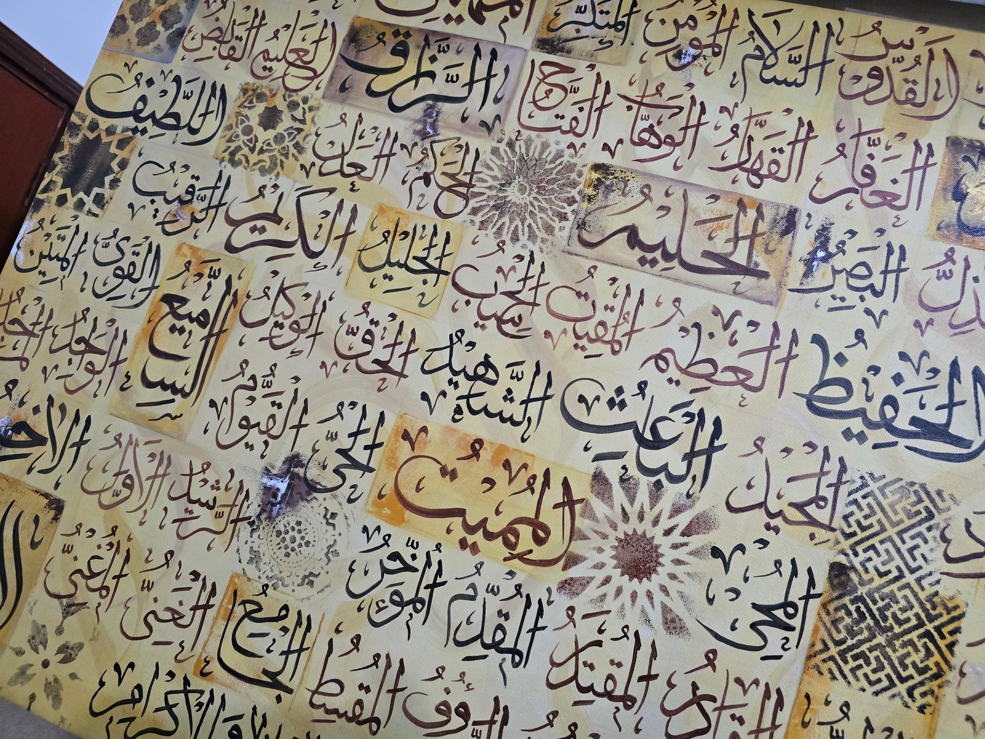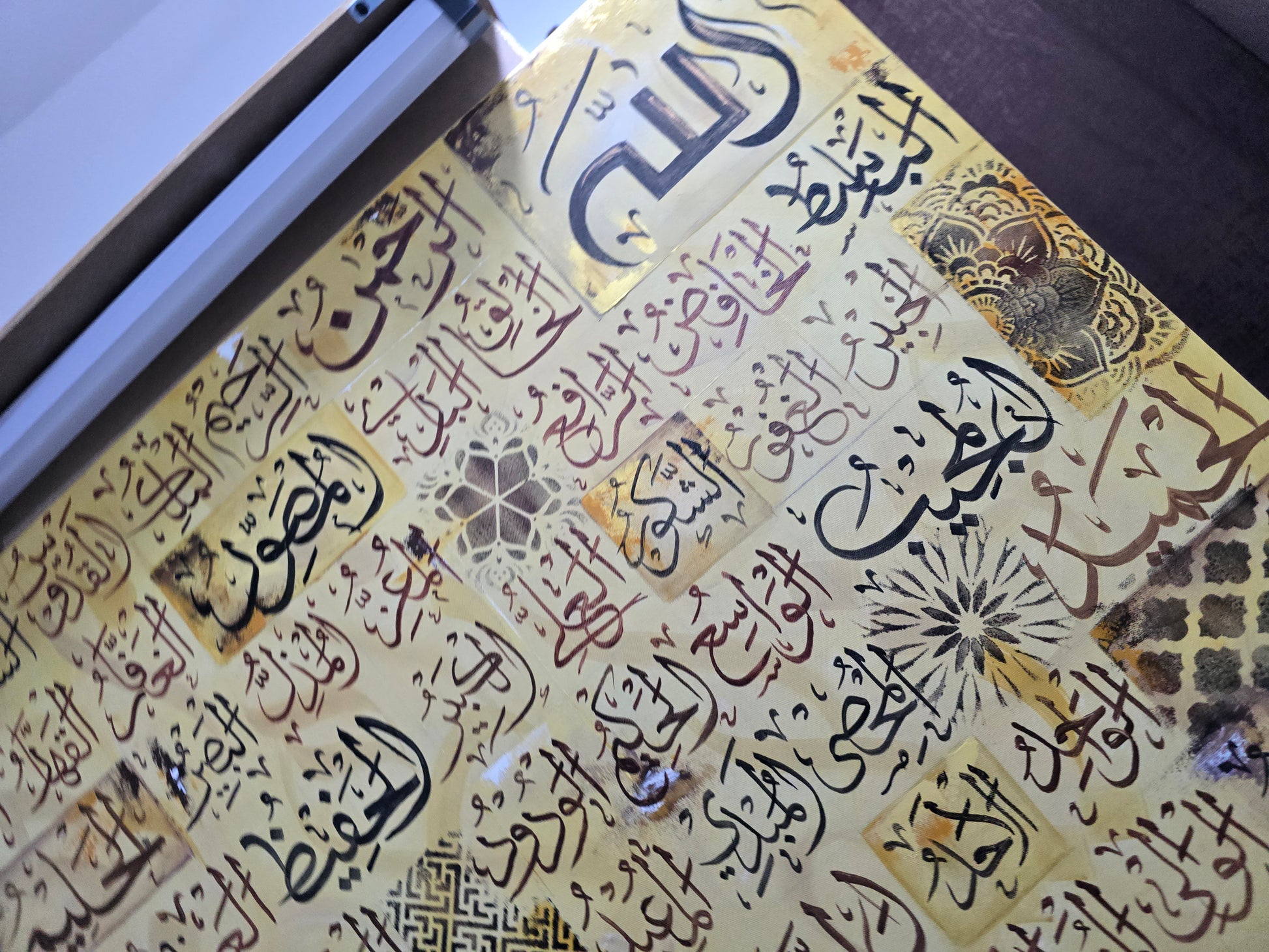 A radiant contemporary Islamic artwork featuring Asma-ul-Husna (the 99 Names of Allah) arranged in a refined mosaic of individually styled calligraphic panels. Rendered in warm antique gold tones with black Arabic script and subtle geometric motifs, this canvas creates a rich tapestry of faith, texture, and visual harmony.